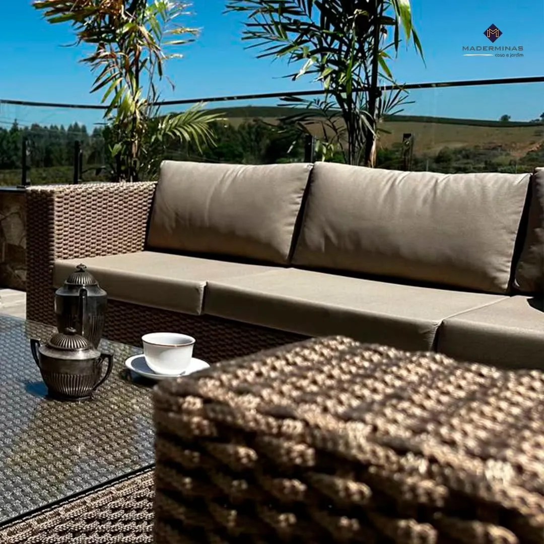 Conjunto Santorini, acompanhado de um sofá, duas poltronas e uma mesa de centro.